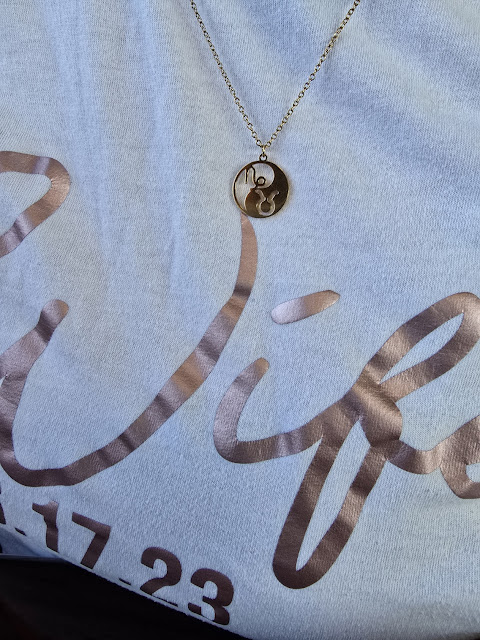 The necklace is a beautiful Yin Yang symbol with my zodiac sign on top (Capricorn) and Terry's Zodiac sign on the bottom (Taurus). I loved this gift as much as the others! I clasped the necklace around my neck immediately and off we went to enjoy our evening.